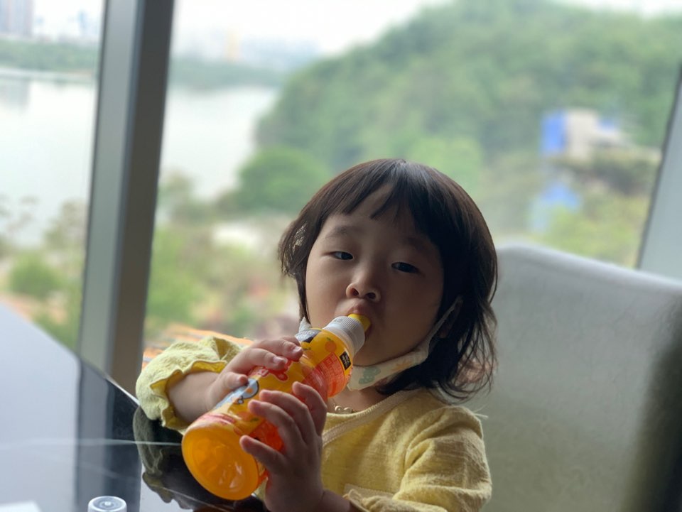 한바퀴돌고나서 3층의 매점? 코너에서 음료를 바꾸고 한강이 바라보이는 뷰가 좋은 자리에 이렇게 자리를잡고선 커피를 마셨습니다. 첫째는 음료를 맛있게도 먹습니다.